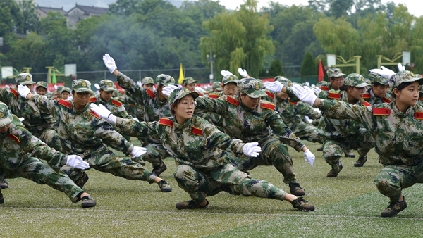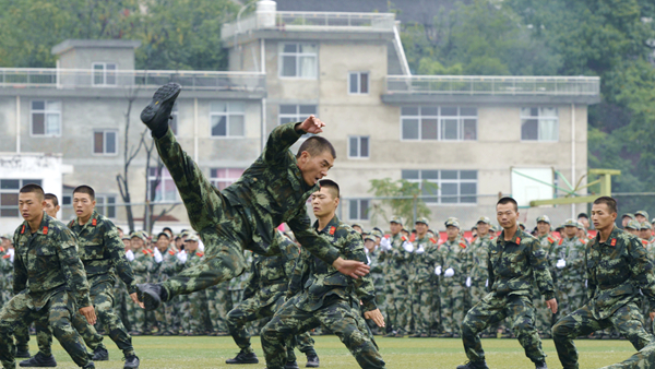 分列式结束后,军训教官和学生进行了格斗、匕首操、五步拳汇报表演。教官们精彩的格斗表演气势威猛如虎、出手洒脱有力,尽展果敢刚强的军人本色,让人热血沸腾;女兵们表演的匕首操动作整齐、声音洪亮,完美诠释了“巾帼不让须眉”的豪情壮志;全体参训学生共同完成的五步拳表演扎实稳健、气势磅礴,展现了我校学子昂扬的青春斗志,引起了现场师生阵阵欢呼与掌声。