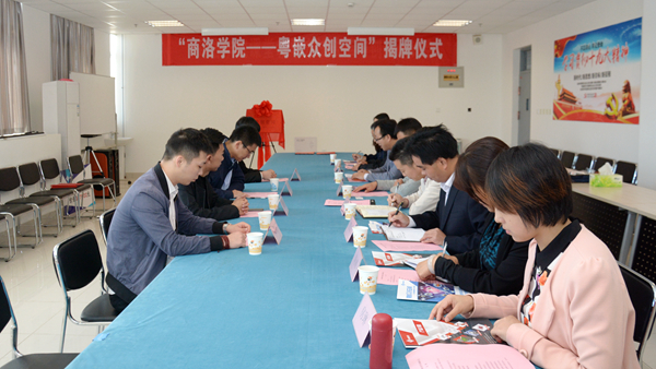 刘勇代表学校与王乐忠共同为众创空间揭牌,并为大家介绍了我校的基本情况和我校校企合作工作开展情况。他指出,商洛学院是一所地方应用型本科院校,产教融合是应用型发展的必由之路,学校高度重视结合专业特色优势与粤嵌科技开展的各项合作,希望电信学院和经管学院以校企共建众创空间为平台,认真谋划、积极实践,在双师型教师培养、理论和实践课程体系改革、实习实训、创新创业竞赛指导等方面积极开展工作,着力探索产教融合人才培养新模式,努力提高应用型人才培养质量。