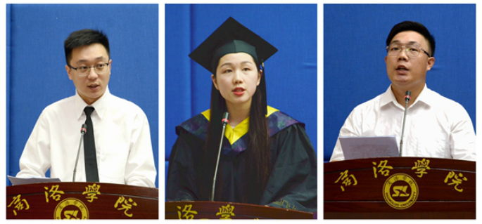 教师代表、经济管理学院董朕博士,毕业生代表、生物学院制药1602班王茜同学及在校生代表、人文学院孙增印同学分别作了发言,为毕业生们送去美好祝福,祝愿每一位毕业生前程似锦、事业有成,拥有幸福的人生。艺术学院毕业生张倩说,在今年如此特殊的形势下,学校为毕业生精心策划组织毕业典礼,同学们非常感动,大家会带着母校的殷切期望和祝福勇敢出发,踏上人生新的征程。
