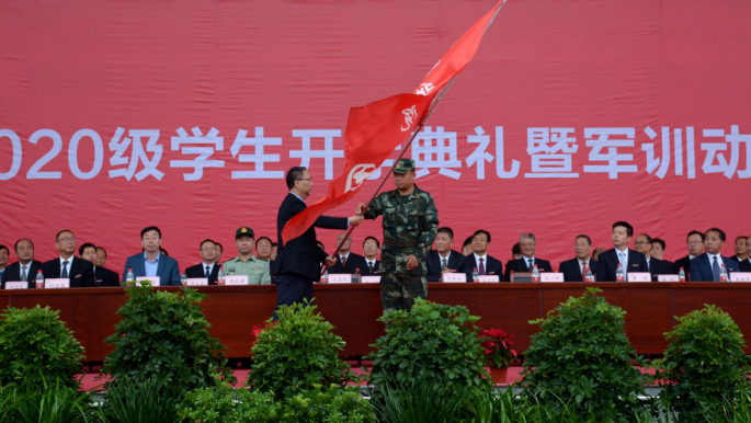 大会伊始,全体起立,奏唱国歌,升国旗。龙治刚为2020级学生军训团授团旗,范新会讲话,刘宝盈宣读2020级新生奖学金表彰决定,出席大会的校领导与嘉宾为获奖新生颁奖。