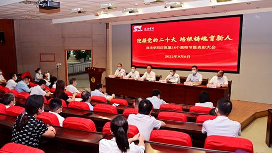 98日下午,我校召开庆祝第38个教师节暨表彰大会,表彰一年来在教学、科研、学生工作和管理服务等方面取得突出成绩的先进集体和个人,激励全体教职工坚定信心、继续努力,奋力谱写学校事业发展新篇章。校党委书记张志昌出席大会并讲话。校长范新会主持大会。党委副书记彭虎军、刘勇,副校长刘宝盈、郭瑾出席大会并为获奖集体和个人颁奖。相关职能部门、各二级院(部)主要负责人及获奖教师代表参加会议。