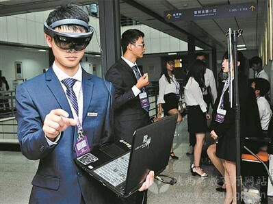 2017年9月16日,第三届中国“互联网+”大学生创新创业大赛总决赛在西安电子科技大学拉开帷幕。图为贵州师范学院的参赛选手在比赛场地外调试自己的博物馆游览辅助系统。新华社发(资料图片)